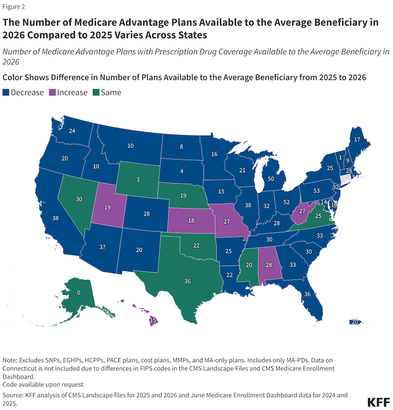 KFF provides this map showing how many plans were available in 2026 compared to 2025.