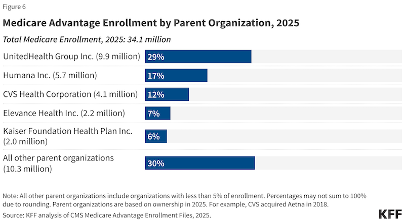 KFF reported that UnitedHealth Group and Humana had about 46% of all MA plan members in 2025. Other plans’ members make up the rest.8